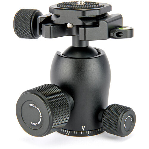 By loosening the ball head's primary locking knob, the head's ball-and-socket joint can be quickly swiveled, angled, fully tilted, or returned to its upright position. Under the primary locking knob is a secondary locking knob, which controls the ability to rotate the head 360°.