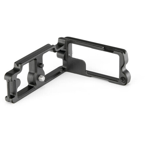 The horizontal side of the bracket is milled to maintain access to the camera's battery, ports, and card slots, and the bracket also enables the LCD screen to tilt freely without obstruction. Located at the top of the bracket is a 1/4"-20 mount for accessories such as an articulating arm, a microphone, or a small video light. Additionally, a slot on each end is for a hand strap, shoulder strap, or the Peak Design Anchor Attachment.