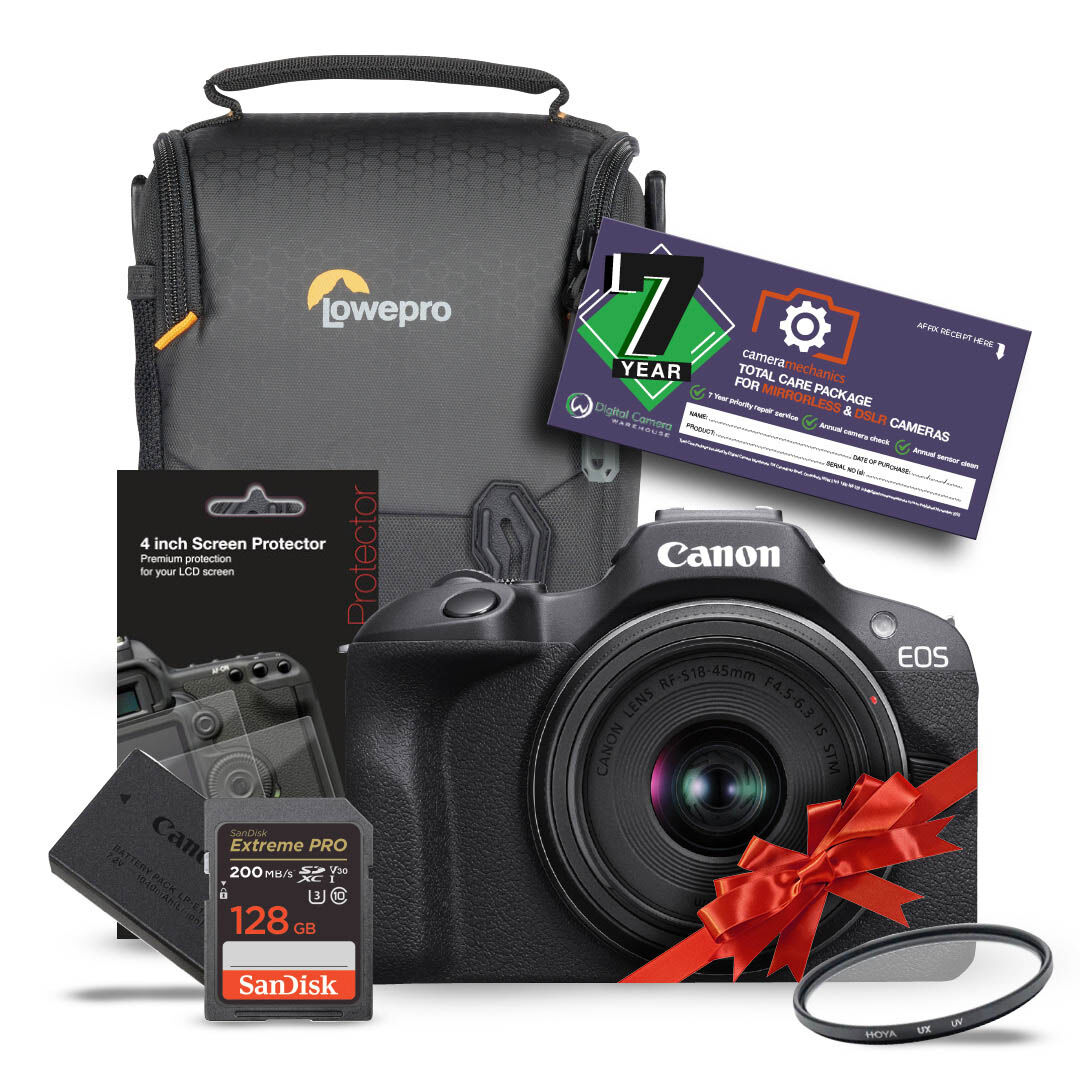 - Includes Canon EOS R100 camera with RF-S 18–45mm lens, 128GB SanDisk Extreme Pro SD card, Canon LP-E17 rechargeable battery, Lowepro Adventura SH120 III bag, ATF universal screen protector (2-pack) and Hoya 49mm UV filter.