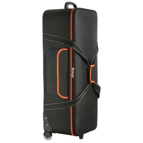 Keep your photo gear safe and secure while travelling with the black CB-06 Wheeled Light Stand and Flash Carrying Bag from Godox. This bag is designed to store and transport items up to 94cm in length and features a zipper closure, dual, connecting top strap handles, a top haul handle, built-in wheels, and nylon construction. For extra protection, the bag also has corner guards to help prevent impact and fabric abrasion, as well as a rubber foot on the bottom for upright standing.