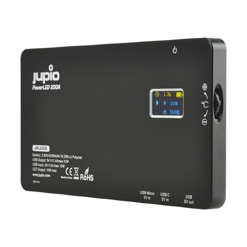 The Jupio PowerLED 200A employs an OLED screen allowing you to monitor all the settings including colour temperature, brightness and charge status as well as battery status. Besides, it features a built-in power bank with a capacity of 4200mAh (16.2Wh) which allows you to charge your smartphone, tablet or other USB devices with a charging current up to 2.4A.