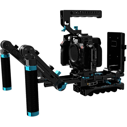 The Raven Black Kondor Blue Ultimate Rig for Canon R5 C is a versatile shoulder rig featuring a baseplate, cage, dummy battery, shoulder pad, top handle with run/stop trigger, and extension arms with handgrips. It also includes a V-mount battery plate and a 12" pair of 15mm rods. The ARRI-style baseplate offers 15mm LWS rod support and comes with a Manfrotto 501-compatible quick release plate. Read more below about the items in this kit.