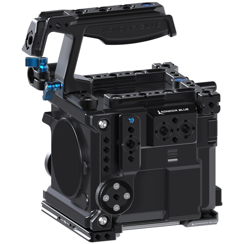 The raven black Camera Cage with Top Handle from Kondor Blue equips your RED V-RAPTOR with multiple mounting plates on all sides, enhancing your accessory compatibility. Its modular design allows the components to be mounted either independently or together, depending on your gear setup requirements. The included top handle offers additional mounting options and features an ergonomic rubber grip for comfortable handling.