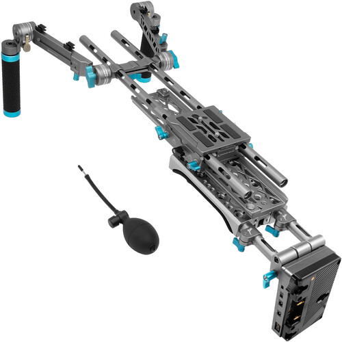 The rig provides a comfortable, air-cushioned shoulder pad with adjustable handgrips and 360° rotating ARRI-style rosette mounts. The bridge plate provides a quick release plate to quickly transfer your camera between handheld and tripod rigs. The 15mm rods and multiple accessory threads allow you to add various optional components such as counterweights, battery plates, a follow focus system, or a matte box.
