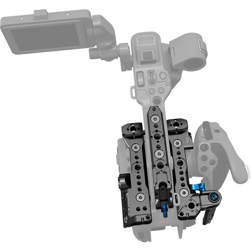 The plates and the accessory rail feature numerous 1/4"-20 and 3/8"-16 mounting threads, as well as 3/8"-16 ARRI-style accessory mounts. The side rail mounts onto the single 15mm rod clamp, providing an additional NATO rail and a handy bubble level. The left plate also features a Sony 8T mount to relocate the original monitor, and it has an angled section to mount accessories away from the cage. The center mount can be removed to use the original FX6 top handle.
