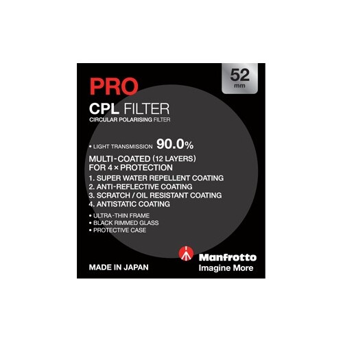 The 52mm Manfrotto Pro Circular Polarising Filter offers uncompromising optical performance as demanded by seasoned photographic professionals. Constructed from quality glass, the CP filter features a comprehensive 12 layer multi-coat to ensure maximum clarity and optical performance. The polarising glass increases colour saturation in your images and renders the sky in your photos a brilliant deep blue. It also removes distracting reflections from surfaces such as windows or bodies of water to ensure your subject remains the primary focus of your composition. A scratch and oil resistant coating is combined with an anti-static coating to assist with optical clarity while a water repellent coating ensures hassle free cleaning.