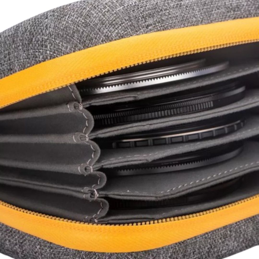 The NiSi Circular Filter Caddy is a compact and lightweight solution designed to hold up to 8 circular filters up to 95mm in size. Crafted with water-repellent material and a secure zipper, it safeguards your filters from the elements. The caddy features shock-proofing for added protection against impact damage, making it ideal for carrying in a camera backpack. With a wide-opening design, accessing all 8 filters is quick and easy, while the microfibre-lined pockets ensure each filter remains scratch-free and protected.