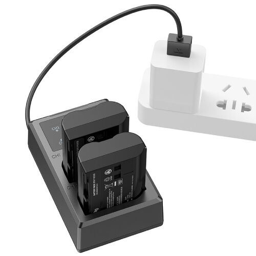 The SmallRig EN-EL15 Camera Battery and Charger Kit 3820B includes two EN-EL15 batteries and one dual battery charger. Equipped with a full decoding chip, the batteries ensure perfect compatibility with a wide range of cameras without triggering pop-up windows. Constructed with a durable, fireproof ABS and PC shell, the frosted surface guarantees a fine touch and long-lasting durability. These batteries are the same size as the original, fitting seamlessly into the camera's battery compartment. The dual battery charger allows for simultaneous charging of two batteries and features an LCD screen that displays real-time charging voltage, current, and capacity. The charger is equipped with a built-in USB-A charging cable and a USB-C input interface, enabling charging via a USB adapter, car charger, or power bank.