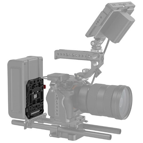 The SmallRig V-Mount Battery Plate 2988 is designed to provide extended battery life for your camera rig, fitting most V-mount batteries with easy access to power ports. It features multiple 1/4"-20" countersinks, M3 and M4 countersinks, 1/4"-20" thread holes, M4 thread holes, and an ARRI 3/8"-16 thread hole, offering versatile mounting options for a dual rod clamp, magic arm, or other accessories. Two stoppers prevent the battery from twisting when mounted. The plate supports a variety of installation methods and is also compatible with the Blackmagic URSA Mini.