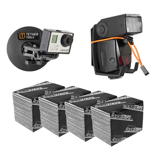Tether Tools’ RapidMount Lights and Action Kit includes one Rapid Mount SLX, one Rapid Mount Q20, and 140 RapidStrip adhesives.
